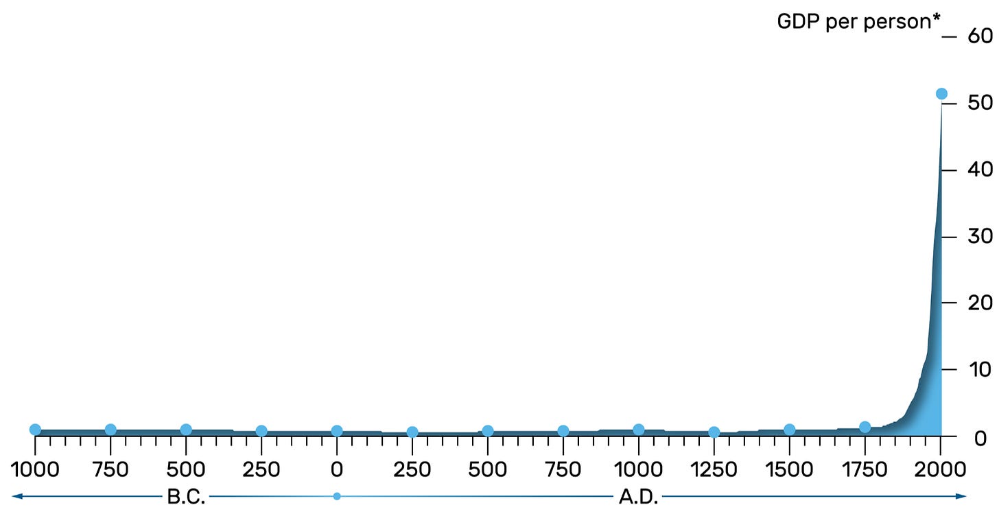 The last time we fully redesigned our means of production the impact on economic growth was dramatic (see graph). For nearly 3,000 years, economic growth averaged about 0.01% per year. Then, around 1750, we redesigned our means of production and growth increased by about 150X to around 1.5% per year. Historians later named that redesign process the Industrial Revolution.